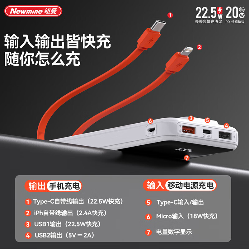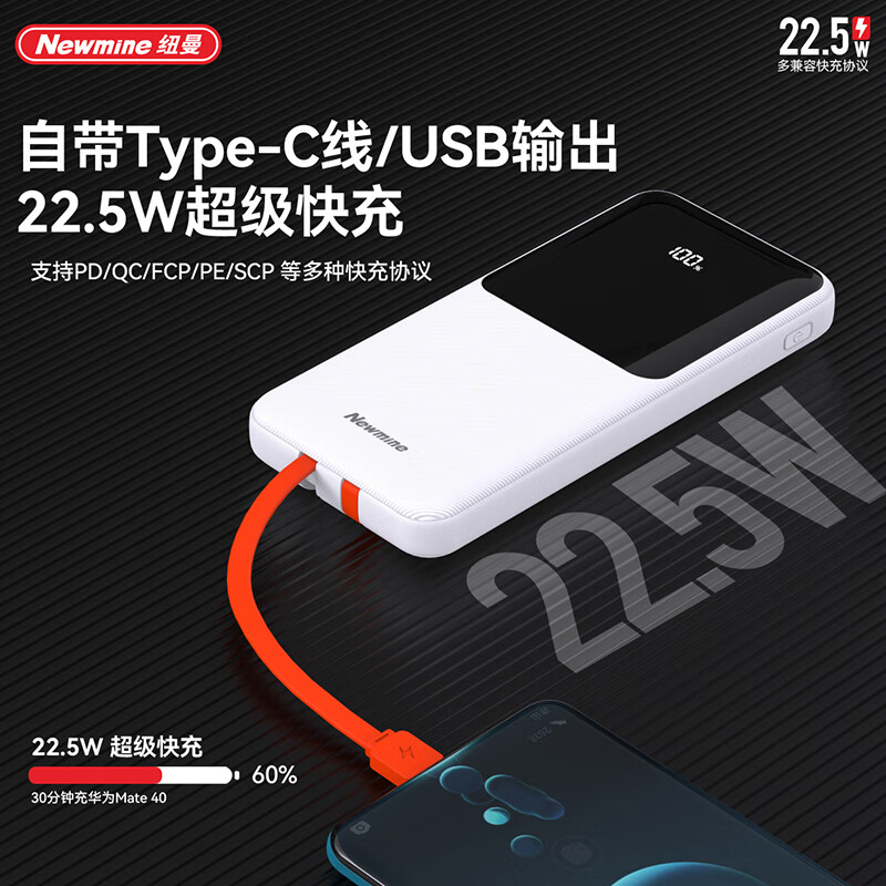 纽曼P03 10000毫安自带线快充数显移动源